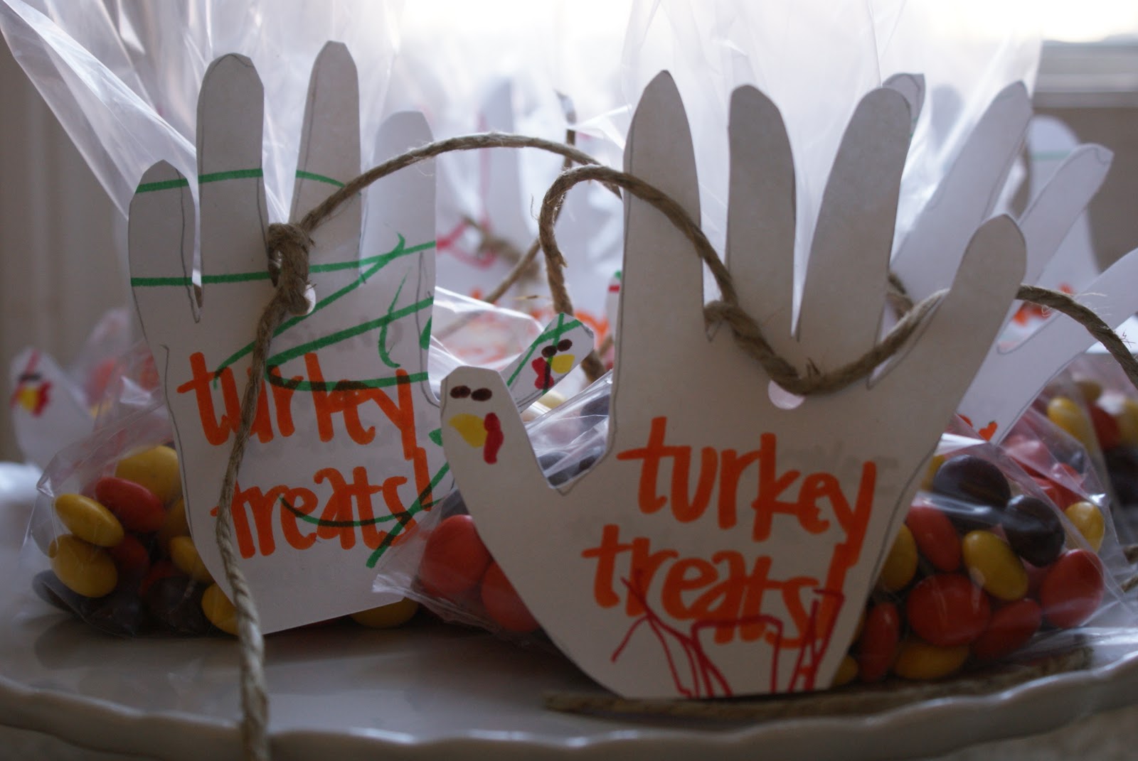 When we were finished scooping, we tied off the bags with twine, and made little handprint turkeys with the following messages: on the front--"Turkey Treats" and on the back--"Dear _____, I am thankful for you! Love, C"